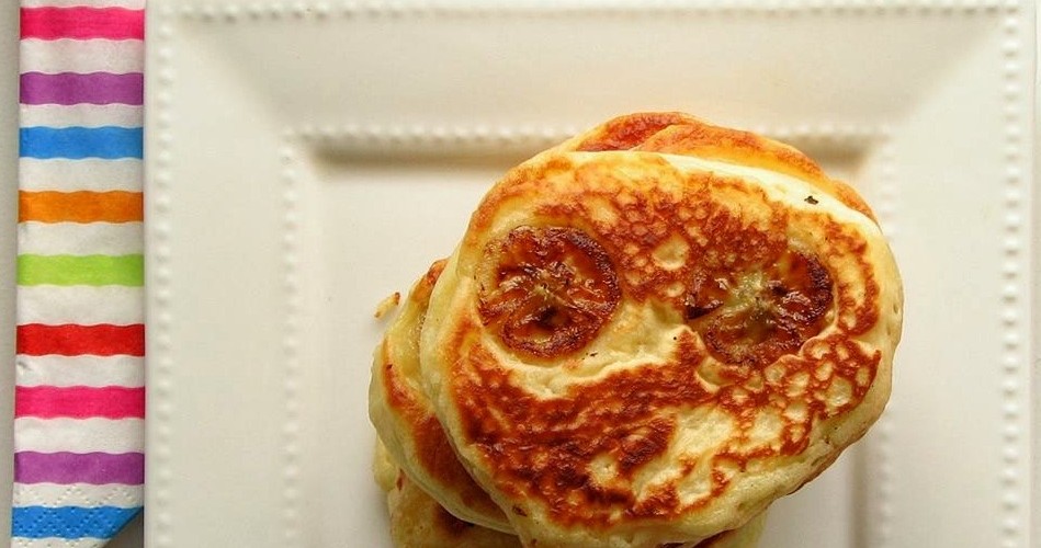 - W czasie gdy placki smażą się i nieco rosną wcisnąć w każdego 2 plasterki banana. Przewrócić placki na drugą stronę i dalej smażyć na średnim lub małym ogniu. Podawać z ulubionymi dodatkami.